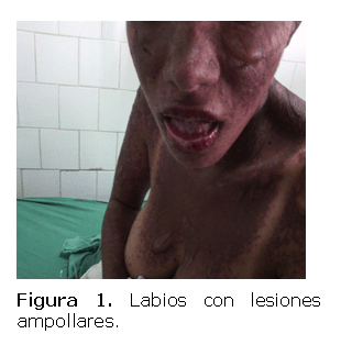 Las características clínicas que ayudaron al diagnóstico de esta paciente fueron, la fiebre de 38 a 39 oC, malestar general, disfagia, sufusión conjuntival y lesiones eritematovesicoampollares en piel y mucosa oral. Teniendo en cuenta que las extensiones de las lesiones superaron el 30 % de superficie corporal, la forma de presentación del SSJ es la más grave: necrólisis epidérmica tóxica.
