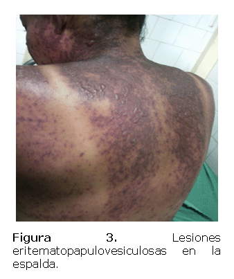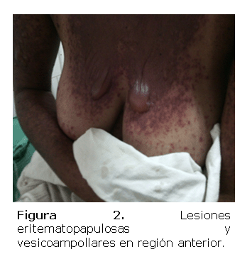 Piel: lesiones eritematopapulosas en cara, tronco y miembros superiores; que desarrollan lesiones vesicoampollares con liquido claro; las mayores de más de 5 cm están en mejillas y región anterior del tórax (Figuras 2 y 3).