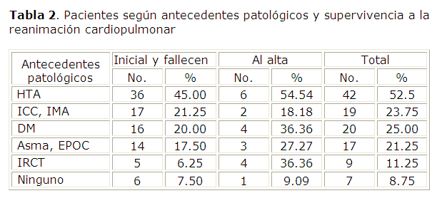 Los antecedentes patológicos estuvieron presentes en el 92 % de los pacientes que sobrevivieron inmediatamente a las maniobras de RCP (Tabla 2); valor similar de aquellos que sobreviven al alta. Los antecedentes patológicos más reportados son: hipertensión arterial (HTA), insuficiencia cardiaca congestiva (ICC), infarto agudo de miocardio (IMA), diabetes mellitus (DM), asma, enfermedad pulmonar obstructiva (EPOC).