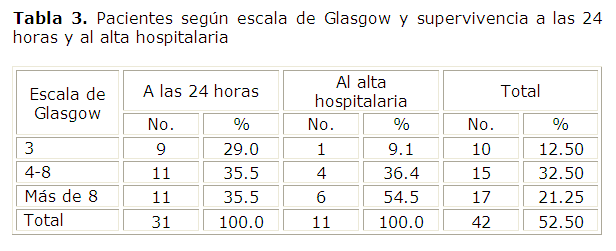 Pasadas las 24 horas sobreviven 31 pacientes, 11 de ellos con un valor de Escala de Coma de Glasgow mayor de 8. Estos pacientes tienen una sobrevida mayor al alta hospitalaria (54.5 %).