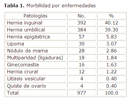 La hernia inguinal (40.12 %) y las hernias umbilicales (39.30 %) fueron las entidades más frecuentemente tratadas por este equipo de trabajo. (Tabla 1).