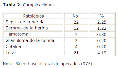 La sepsis de la herida fue la complicación más frecuente seguida por seroma con el 2.25 y 1.25 %, respectivamente (Tabla 2).