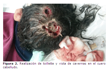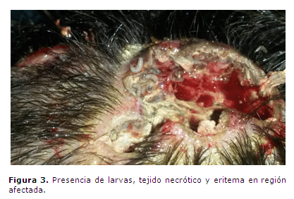 Al examen físico se constató aumento de volumen de la cabeza y en varias regiones del cuero cabelludo (Figura 1), acompañadas de costras y secreciones amarillas, observándose numerosas larvas.