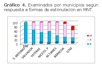 En relación al comportamiento de la respuesta, formas de estimulación en MNT según municipio, San Antonio del sur fue el que mayor porciento de respuestas correctas alcanzó (100 %), seguido del Salvador con un (67 %), mientras que en el municipio Guantánamo fue donde un 17 % no respondió correctamente (Gráfico 4).
