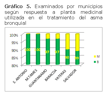 Al analizar el comportamiento del inciso, planta medicinal utilizada en el tratamiento del Asma Bronquial, según municipio, (Gráfico 5), se debe destacar que en el examen la mayoría de los municipios responden correctamente, relacionando la utilización de la Fitoterapia o plantas medicinales en el tratamiento del asma, lo cual se corresponde con los estudios realizados por Hernández Portilla18, García Quiala M y Díaz Pita G.19