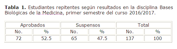 Se realizó un estudio descriptivo transversal durante el primer semestre del curso 2016/2017, con el objetivo de analizar los resultados académicos de los estudiantes repitentes del 1er año de la carrera de Medicina, en la disciplina BBM en la Facultad de Ciencias Médicas de Guantánamo.