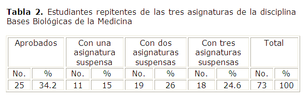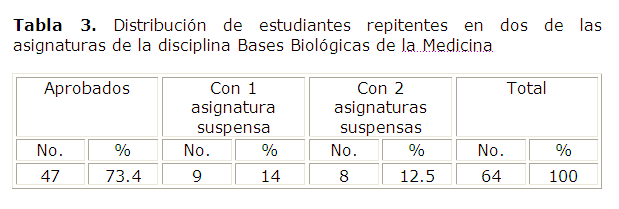 En estos resultados tuvo gran influencia los repitentes que cursaron las tres asignaturas de la disciplina BBM, vale destacar que más del 50 % resultó suspenso en dos y tres asignaturas y solo el 34.2 % aprobó, como puede observarse en la Tabla 2.