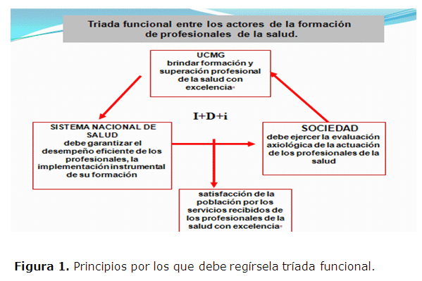 La tríada funcional (Ver Figura 1) entre los actores de la formación de profesionales de la saludimplica una coherente correspondencia en eldesempeño de las instituciones comprometidas con el efectivo servicio integral que presten los profesionales de la salud en el contexto de la solución de las necesidades sociales a que debe responder, lo que puede favorecer la mejora en el modo de actuación de los profesionales de la salud.