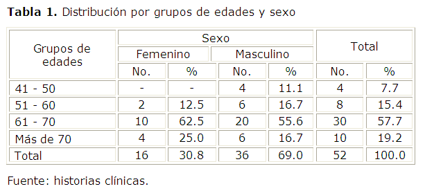El grupo de edad con mayor número de pacientes fue el de 61-70 años, 57.7 % de los casos. En cuanto al sexo se encontró franco predominio del sexo masculino (69.2 %) sobre el sexo femenino (30.8 %) con una relación de 2:1 (Tabla 1).