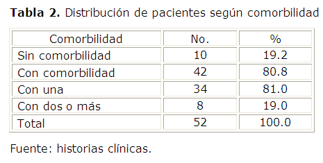 La existencia de comorbilidad asociada en pacientes diagnosticados de carcinoma broncogénico no es extraordinaria (Tabla 2). En esta investigación la mayoría de los pacientes, 42 (80.8 %), presentó enfermedades asociadas