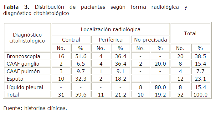 En la Tabla 3, se distribuyen los pacientes según la localización radiológica y el diagnóstico citohistológico. En las lesiones centrales se realizó mediante broncoscopia en 16 pacientes, seguida por el esputo citológico en 10, mientras que en las lesiones periféricas se hizo en 36.4 % de los casos por broncoscopia y por CAAF de ganglio a otros 36.4 %.