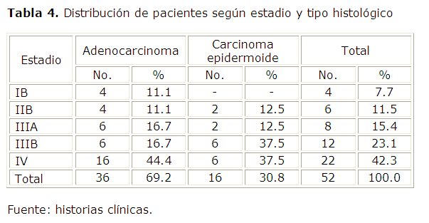La distribución de los pacientes según etapa clínica y tipo histológico (Tabla 4), muestra como el adenocarcinoma se diagnosticó en 69.2 % de los casos, de ellos 16 en etapa IV (44.4 %), seguido de las etapas III a y III b con 6 casos cada (33.4 %). Mientras tanto el carcinoma epidermoide se encontró en 16 (30.8 %), de ellos 6 casos en etapa IV y 6 en etapa III b (37.5 %). De forma general la mayor parte de los casos se diagnosticaron etapa III y IV, 42 de los 52 pacientes incluidos en la investigación, o lo que es lo mismo, más del 80 % de los casos fueron diagnosticados en etapas avanzadas de la enfermedad.