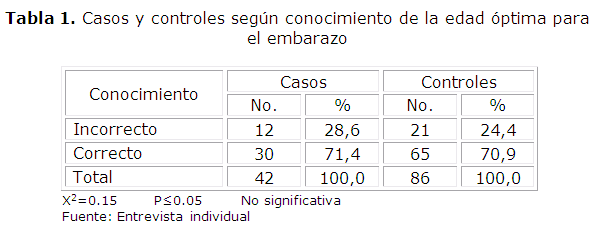 La Tabla 1 muestra los casos y controles según conocimientos de la edad óptima para el embarazo, reflejando que la mayoría de las adolescentes sí tenían un correcto conocimiento acerca de la edad óptima para salir embarazada, 71,4% de los casos y un 70,9% de los controles.