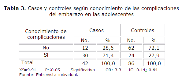 En cuanto al conocimiento de las complicaciones del embarazo en las adolescentes (Tabla 3), el grupo de casos que el 71,4 % respondió si conocerlas. En el grupo control por el contrario predominó el no conocimiento (72,1%).