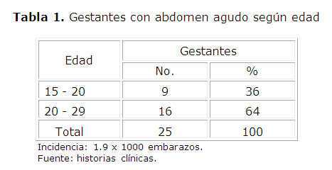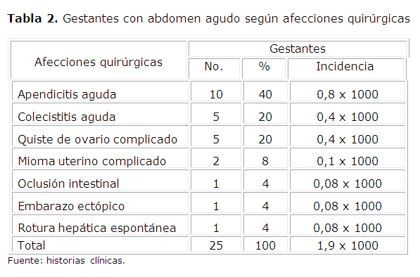 El abdomen agudo en el embarazo se presentó con una incidencia de 1,9 por cada 1 000 gestantes.