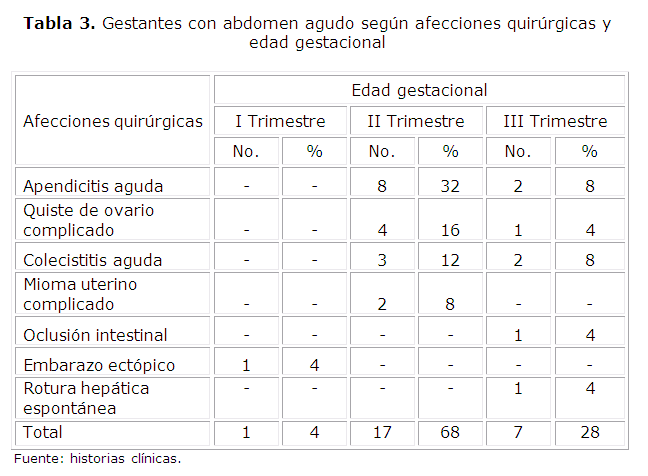 El abdomen agudo quirúrgico fue más frecuente en pacientes que cursaban su segundo trimestre de embarazo (68 %), seguido por las gestantes del tercer trimestre (28 %) (Tabla 3).