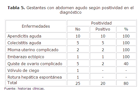 Te Linde9 plantea que los tumores de ovario, la apendicitis aguda y las complicaciones miomatosas son los tres motivos más frecuentes de abdomen agudo quirúrgico en el embarazo. En nuestra serie la apendicitis aguda fue la más frecuente (40 %).