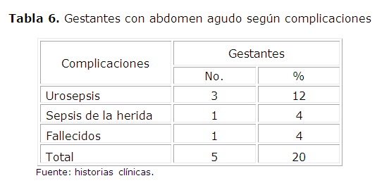 Predominaron las complicaciones sépticas: urosepsis (12 %) y sepsis de la herida quirúrgica (4 %), para un índice de morbilidad del 20 %, con un índice de mortalidad materna del 4 % (Tabla 6).
