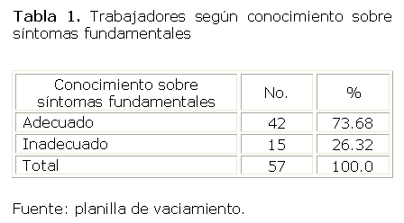 La Tabla 1 que muestra la distribución de los trabajadores según conocimiento sobre síntomas fundamentales, se puede observar predominio de los trabajadores con conocimiento adecuado sobre los principales síntomas con 42 para 73.68 %.