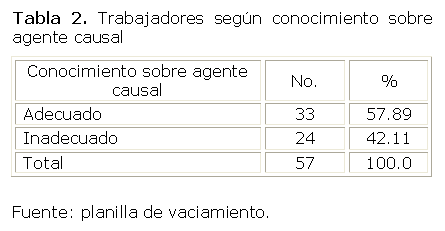 En la Tabla 2 que muestra los trabajadores según conocimientos sobre el agente causal, se constata que el mayor posee conocimiento adecuado sobre el agente causal de la enfermedad con 33 para 57.89 %.