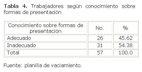 La Tabla 4 que muestra los trabajadores según conocimiento sobre las formas de presentación, se observa predominio de los trabajadores con conocimiento inadecuado con 31 para 54.38 %.