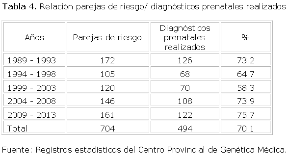 Por tal motivo y como se puede observar en la Tabla 4 donde se analiza la relación entre parejas de alto riesgo y diagnóstico prenatal solo se logra estudiar al 70 % de ellas. Considerados muy insuficientes los estudios moleculares que se realizan, lo que hace ineficiente el programa al no concluir el estudio genotípico en tiempo útil10, es decir antes de las 22 semanas de gestación.