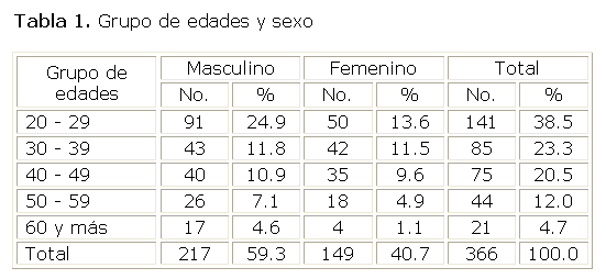 Los resultados obtenidos, en lo que a edad y sexo se refiere coinciden con los referidos por otros autores que han reportado mayor incidencia en hombres en edades comprendidas entre 20 y 50 años.8-11