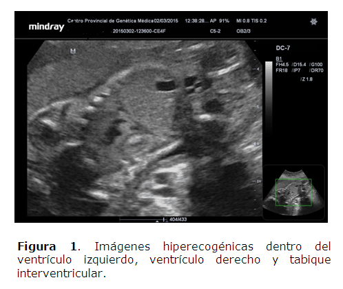Se le realizó ultrasonido que informó: feto único, con buena vitalidad, líquido amniótico normal, placenta anterior. Nos llamó la atención la presencia de múltiples imágenes hiperecogénicas dentro del ventrículo izquierdo, ventrículo derecho y tabique interventricular que siguen los movimientos de contractilidad del musculo cardíaco; se localizó el mayor de esta imágenes en el tracto de salida del ventrículo izquierdo, sin otras alteraciones morfológicas fetales (Figuras 1).